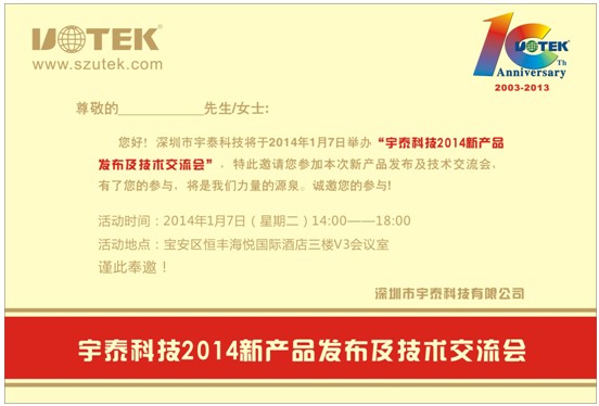 您們好!為了讓更多的新老朋友們對宇泰科技有更深的了解,通過宇泰科技更直觀得了解到最新、最前沿的智能通訊產品及技術。由深圳市宇泰科技有限公司舉辦的“宇泰科技2014新產品發布及技術交流會”誠邀您的參與!