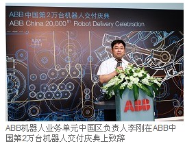 ABB機器人業務單元中國區負責人李剛表示:“第2萬臺機器人下線是ABB機器人業務在國內發展的新起點。堅持‘在中國,為中國和世界’的發展戰略,ABB將繼續提升本土研發能力和推出新型機器人產品,以領先的機器人技術與解決方案支持國內外客戶提高生產率和競爭力,助力國內產業升級。”