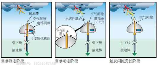 在雷暴的動(dòng)態(tài)階段,在下行先導(dǎo)的更近的路徑上,接閃器的半球體或圓頂電壓將通過(guò)電容性耦合而上升。當(dāng)電壓足夠高時(shí),球體和接地棒之間的空氣間隙處將產(chǎn)生觸發(fā)電弧。