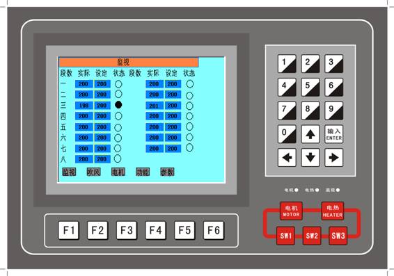 5.7"TFT 液晶顯示器,240*320點(diǎn)陣,中英文顯示; 鍵盤部分用參數(shù)輸入、加熱與電機(jī)的啟停控制; 采用RS485接口與主機(jī)、PC機(jī)或其它工業(yè)產(chǎn)品(如變頻器、PLC等)通信,實(shí)現(xiàn)程序在線燒錄及相關(guān)動(dòng)作控制; 參數(shù)曲線記憶功能,繪制10分鐘以內(nèi)的溫度變化曲線。多組模具參數(shù)記憶功能; 15段的溫度采樣及控制,8段吹風(fēng)控制; 溫度輸入接K型熱電偶,測(cè)溫范圍是0~400℃; 三路DA輸出0~10V電壓,控制電機(jī)轉(zhuǎn)速; 二路AD輸入,采樣0~10V電壓信號(hào),用于壓力閉環(huán)控制; 繼電器輸出可接交流接觸器; 主機(jī)控制采用220V輸入開關(guān)電源, 輸出 +24V/1.5A,+12V/1A,–12V/1A; 顯示面板采用220V輸入開關(guān)電源, 輸出 +24V/1A; 上下位機(jī)均為高性能DSP微處理系統(tǒng); 溫度主要采用PID控制方式,控制參數(shù)可調(diào)并存于密碼頁(yè)面中; 完善的報(bào)警功能:當(dāng)前工況之溫度,電流,轉(zhuǎn)速不在預(yù)設(shè)范圍之內(nèi)時(shí),系統(tǒng)報(bào)警請(qǐng)求認(rèn)為干預(yù),當(dāng)擠出機(jī)檢測(cè)缺料,牽引力不足等情況及系統(tǒng)故障時(shí),也有相應(yīng)報(bào)警輸出; 采用美國(guó),臺(tái)灣進(jìn)口優(yōu)質(zhì)元器件,系統(tǒng)故障率低,穩(wěn)定性好。