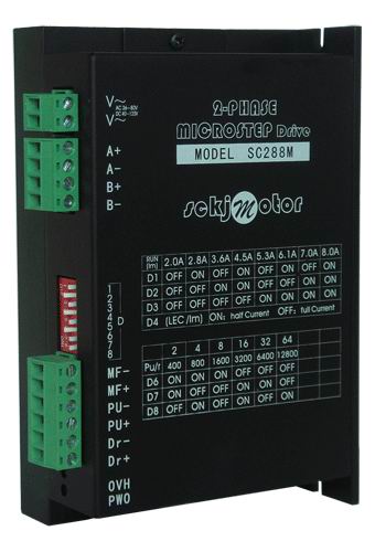 SC288M型細分步進電機驅動器,工作電壓AC36-80V或DC40-120V,適配四、六、八出線電流在8A以下,外徑86-110mm的各種型號的二相混合式步進電機。
