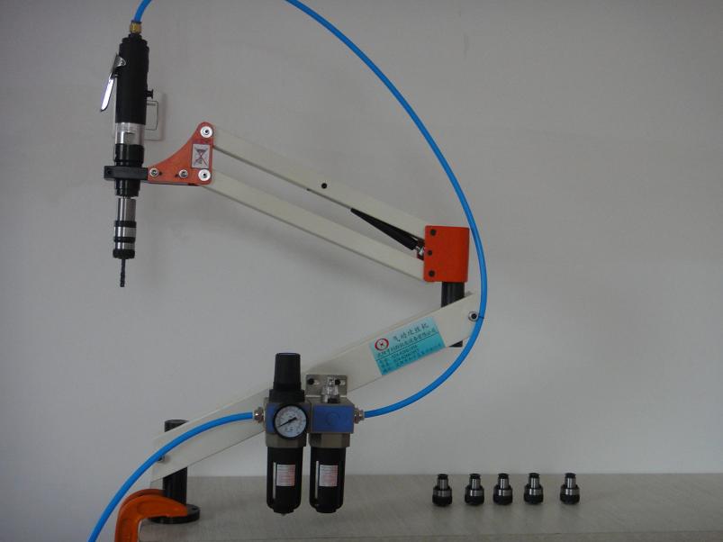 使用高壓空氣帶動氣動馬達來帶動攻絲.氣動攻絲機的馬達是使用緊湊型的葉片式氣動馬達最大轉速可達10000轉每分鐘以上,通過形星減速機構,可以達到大扭力輸出的功能.外觀小巧.并可實現正反轉.,氣動馬達配上機械式手臂,最大工作半徑可以達到2000MM左右,可實現大工件及一個工件上多個孔位的時候,重復定位快,大大提高了工作效率.代替了手工攻絲.氣動馬達還可以配上帶有扭力保護的安全夾頭,可實現不斷絲錐提高了工件的加工品質;