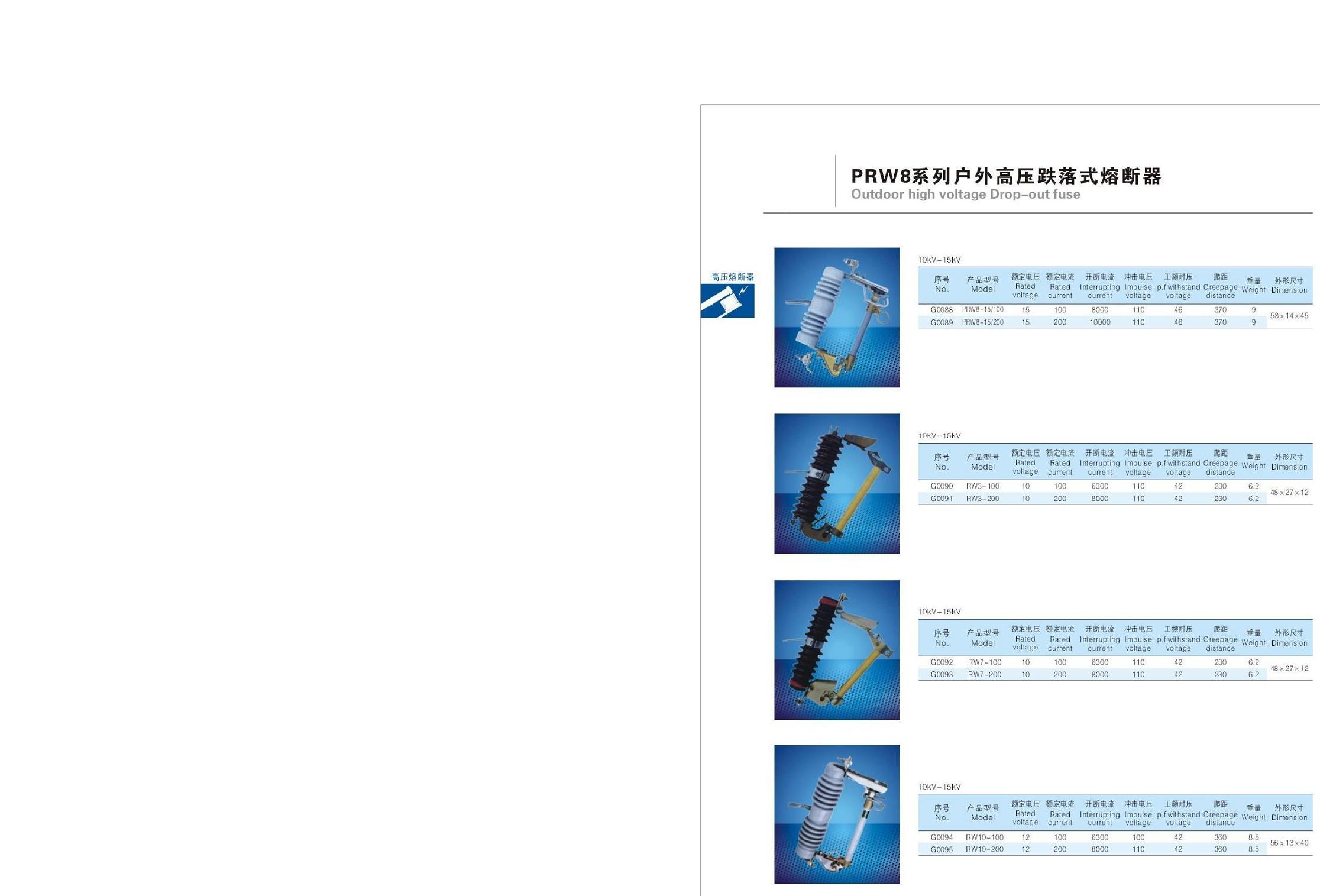 PRW8系列戶外高壓跌落式熔斷器RW3,RW7,RW10,RW11。適用于交流50HZ,額定電壓10KV~35KV戶外架空配電系統上,作為線路或電力變壓器的過載和短路保護用,本產品在正常動作或操作后,載熔件跌落,形成可見斷口,對維護檢修起到安全保證作用。本產品符合國家GB15166.2標準和國際電工委IEC60282-1標準