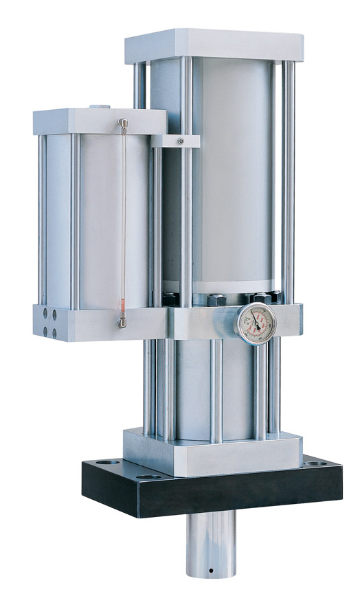 氣液增力缸先由大面積活塞端的低氣壓產生小面積柱塞端的高液壓,高液壓直接作用在雙支承工作缸活塞桿的大面積柱塞端,然后將力直接傳遞給與工作缸活塞桿另一端通過螺紋相連的施力部分。 ●最大6—8Kg壓縮空氣驅動,即可達到1噸—200噸沖壓力,無需液壓系統。 ●三階段工作過程 a氣動的快進行程 工作缸活塞桿驅動施力部分快速小力接觸工件 —“軟到位”技術 b氣液增力缸的力行程 在總行程范圍內任一位置,施力部分一接觸工件,即自動啟動力行程進行全力沖壓—“增力自適應 ” c氣動的返回行程。 ●工作過程中自動啟動力行程極大的保證了工作過程無沖擊振動、噪音極低,有效的提高了工件加工質量及施力部分整體壽命。 ●控制簡單、可靠 如同控制一個普通氣缸一樣,由一個二位五通閥即可實現全部控制,如用行程開關控制力行程及快進行程或以不同的壓力控制力行程等均可實現。 ●三階段工作行程的速度及增力的大小與行程在規定范圍內均可無級調節并可PLC控制。 ●大倍數的增壓比保證了氣液增力缸在同噸位的氣缸、液壓缸中直徑最小,所需安裝空間最小。 ●與同噸位氣缸或液壓系統或其他機構相比,能耗極低,動作頻次高。部分型號可至125次/分。 ●全部進口的優質密封圈允許使用無潤滑壓縮空氣,巧妙的設計結構完全阻止了壓縮空氣進入油腔內。 ●每只增力缸均設有一個高壓測量接口以便于如下操作: a.接壓力表。 b.接壓力繼電器以設置不受壓縮空氣影響的增壓力,達到預設壓力后自動返程。 c.實現用戶需要的其他功能。 ●維修與保養 維修時氣液增力缸極容易更換,優質進口密封件磨損極低,如密封件損壞可依據裝配圖在一小時內更換完畢。 ●通過施力部分與工件接觸后才啟動的力行程可以進行精壓、沖裁、拉伸成型、壓裝等多種沖壓加工。 |