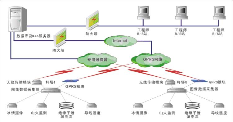 遠程數據圖像采集器是一臺高性能的嵌入式計算機,它部署在圖像監控的現場,它從CCD攝像機采集模擬視頻信號,然后把圖像數據進行編碼和壓縮成為數字視頻數據;通過485數據采集擴展版,將高壓傳輸線路的導線泄漏電流、絕緣子污穢、雷電電流、導線溫度、環境溫濕度、線路走廊山火(環境CO2含量)、現場風速雨量等現場數據實時采集并本地緩存。最后利用EDGE無線傳輸模塊將圖片及現場數據以IP包的方式發送到圖像數據監控服務器。圖像數據監控服務器和圖像數據監控客戶端分別是裝有遠程圖像監控服務端軟件和客戶端軟件的PC機,它們都連接在互連網絡上,由于遠程數據圖像采集器沒有固定的IP地址,所以客戶端主動去瀏覽監控圖像和設置監控參數都是通過服務器來中轉的。
