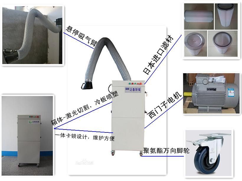金屬焊接、激光切割、打磨作業(yè)時,大量煙塵懸浮在車間內(nèi),被吸入人體肺部會嚴(yán)重影響身體健康,導(dǎo)致慢性錳中毒,電焊工塵肺病等嚴(yán)重疾病。因此必須在焊接煙塵進入焊工呼吸區(qū)前把這些有害煙塵進行凈化處理。 青島泛泰移動式焊接煙塵凈化器,是一款專門針對治理焊接、切割、打磨時,產(chǎn)生在空氣中大量懸浮對人體有害的細(xì)小金屬顆粒而設(shè)計的凈化裝置,適應(yīng)于單雙工位,它凈化效率高,輕巧靈活,配有2-3米長的萬向吸氣臂,在不同的工作地點移動更方便靈活,操作方便。