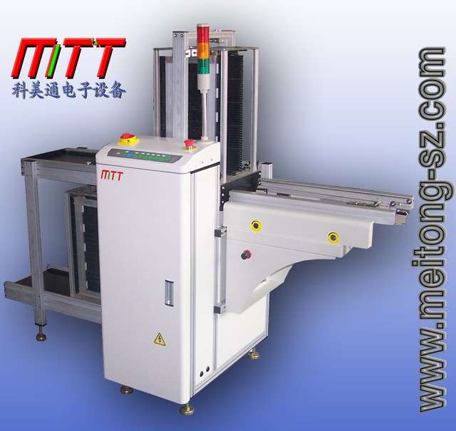 UNLOADER SMT自動收板機(下板機) 型號:MTT-XB-A3 深圳市美通電子設備有限公司http://www.meitong-sz.com,0755-27905052,13510163050,適用:SMT和AI自動生產線,生產完成后自動將PCB板收進料架內,無須用手接觸PCB板,更好的保護了PCB板。并可設置升降格數,本機具有升降精度高、自動進出料架、故障(音、色)報警功能,是實現全線自動化及高產量的必備設備特點: 1. 采用可編程控制器PLC控制系統。 2. LED輕觸式控制界面,操作方便。 3. 收板推進采用SMC無桿型氣缸推PCB板進料架,推力可調保防PCB板 不被推壞。 4. 氣控采用進口中排電磁閥,使推板氣缸可以停在任意的位置。 5. 料架定位用4個氣缸分別固定料架的4點,使送板的精度更為可靠。 6. 收板出口裝有PCB保護感應器,更為有效的保護了PCB板。。 7. 收板步距可分為四種(10,20,30,40MM) 8. 可放置3個料架(或者客戶要求) 9. 方向可選取從左至右或右至左 10.標準配備信號,可與其它設備進行在線連接. 本公司所有設備均可根據客戶要求定做!