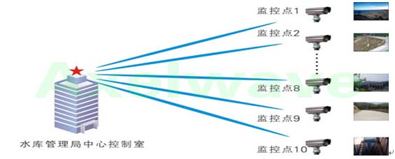 該系統主要由三部分組成,前端視頻、語音、數據等采集系統,無線網絡傳輸系統,水庫管理中心控制系統。前端的多路視頻、數據及IP電話等都先通過交換機進行匯聚,然后進入艾克賽爾(Axelwave)的無線網橋進行無線傳輸,所有前端點都采用太陽能供電系統供電,在陰雨條件下可以支持連續工作72小時以上。中心水庫管理控制室與前端組成點對多點的無線傳輸鏈路,將前端的所有信息匯總至控制室?刂浦行目梢詫崟r監控各前端點的視頻圖像,如水庫水位情況,閘門、大壩的工作狀態,水面及岸邊情況等等,另外還能觀察到前端發回各種的實時數據信息,如水庫水質變化、水庫天氣變化等,真正做到對水庫各重點區域的全天候、多角度、全方位的實時監控,做到有效應對各種突發事件,確保了水庫各方面的安全運行。