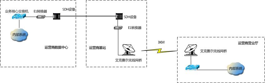 隨著城市化的發展,各大電信運營商在各地建設的直屬營業廳數量在不斷增加。而營業廳必須要能接入運營商內部系統網絡才能為客戶辦理各種業務。傳統的解決辦法是采用DDN等窄帶網絡技術手段,目前這種方式已經基本被淘汰,取而代之的是采用光纖接入,為各營業廳專門鋪設光纖。但光纖的鋪設又經常遇到與市政的矛盾等各種原因無法進行。這種情況,嚴重制約了運營商業務的開展。艾克賽爾(iAxel)針對這一情況,專門設計了無線寬帶傳輸系統,解決各營業廳接入運營商系統網絡的問題。 艾克賽爾(iAxel)這一無線寬帶傳輸系統,針對“最后一公里”接入而設計,使用寬帶無線網橋設備。具體而言,運營商的內部網絡系統通常都是接入到運營商數據中心專門的業務交換機,中間通過E1、運營商SDH系統在運營商分布在城市與鄉村的基站落地,再利用艾克賽爾(iAxel)無線網橋實現營業廳內部網絡系統的接入。一般而言,營業廳到運營商基站的距離通常都在幾公里以內,無線寬帶傳輸能取得非常好的效果,最高可以提供108Mbps的帶寬。另外,艾克賽爾(iAxel)的寬帶無線網橋還支持多種數據加密技術和接入控制技術,確保數據傳輸的安全。