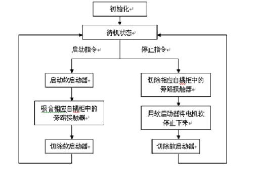 目前,國內外的電機軟啟動器控制系統一般都采用1臺軟啟動器配1臺電機的控制方案,為了節省投資,經過多方論證,并且與上海津信變頻器有限公司的技術專家一起進行了模擬試驗,最終決定采用1臺軟啟動器帶多臺電機的方案。同時,也為了最大限度地保障設備無故障連續運行,對原自耦啟動柜進行了改造,保留原來自耦啟動的全部功能,并且利用原自耦柜中的運行接觸器,作為軟啟動器的旁路接觸器,在軟啟動器啟動完畢后將其旁路,以便軟啟動器可以繼續控制其他的電機。軟停止控制策略則正好相反,首先要將原自耦柜中的運行接觸器斷開,電機切換到由軟啟動器控制,然后啟動軟啟動器的軟停止功能,逐漸減小輸出電壓,將電機慢慢停下來,最后軟啟動器退出,等待接受下一個啟動或停止操作。