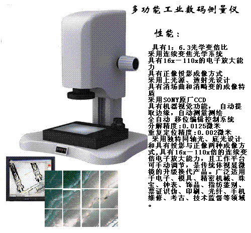 視覺測量  視覺檢測  視覺定位  視覺分析 集合了數字科技成果與計算機屏幕測量技術的數碼投影測量系統,它應用了獨有的雙向同步倍率校正技術(專利),采用獨特同軸光、底光、側光設計和具有投影與正像兩種成像方式,測量精度為±2um,分辨率0.001mm.能夠有效的解決了電子產品的誤差和屏幕的局限和滿足各種倍率的要求。產品是針對精密電子產品檢測制造業日益精湛的加工工藝所帶來的精確需求開發而成。