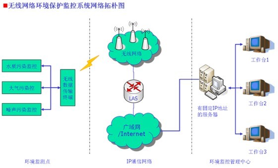 系統(tǒng)主要是由一個(gè)監(jiān)測(cè)中心,若干個(gè)固定監(jiān)測(cè)站和專用GPRS/CDMA無線終端組成。監(jiān)測(cè)中心對(duì)各個(gè)監(jiān)測(cè)站進(jìn)行控制指揮,各監(jiān)測(cè)站收集各種污染參數(shù),兩者間的控制信號(hào)和監(jiān)測(cè)數(shù)據(jù)通過GPRS/CDMA無線終端傳送完成。監(jiān)測(cè)中心既是各監(jiān)測(cè)站的指揮中心,又是監(jiān)測(cè)站監(jiān)測(cè)數(shù)據(jù)的匯集、處理的存儲(chǔ)的數(shù)據(jù)庫(kù)。各監(jiān)測(cè)站可設(shè)置為自動(dòng)向監(jiān)測(cè)中心發(fā)送信息;也可設(shè)置為平時(shí)處于待機(jī)狀態(tài),在收到監(jiān)測(cè)中心的指令后才開始啟動(dòng)工作,將信息發(fā)送給監(jiān)控中心。各監(jiān)測(cè)站有數(shù)據(jù)采集。命令識(shí)別、數(shù)據(jù)發(fā)送的功能。