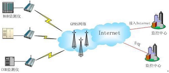 在水質(zhì)系統(tǒng)中,常常需要對(duì)眾多的排污口污水的PH值、DO、溫度、電導(dǎo)和排污流量進(jìn)行實(shí)時(shí)監(jiān)控實(shí)時(shí)監(jiān)測(cè),大部分監(jiān)測(cè)數(shù)據(jù)需要實(shí)時(shí)發(fā)送到管理中心的后端服務(wù)器進(jìn)行處理。由于監(jiān)測(cè)點(diǎn)分散,分布范圍廣,而且大多設(shè)置在環(huán)境較惡劣的地區(qū),通過電話線傳送數(shù)據(jù)往往事倍功半,通過GPRS/CDMA/EDGE無線網(wǎng)絡(luò)進(jìn)行數(shù)據(jù)傳輸,成為水質(zhì)監(jiān)測(cè)部門選擇的通信手段之一。污染源監(jiān)測(cè)設(shè)備可將采集到的污染數(shù)據(jù)和告警信息通過GPRS/CDMA無線網(wǎng)絡(luò)同時(shí)發(fā)送到多個(gè)水質(zhì)監(jiān)測(cè)部門,實(shí)現(xiàn)對(duì)排污單位或個(gè)人的及時(shí)管理,可以大大提高環(huán)保部門的工作效率。