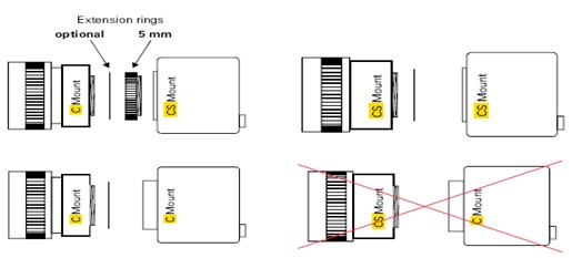 。因此,需要考慮相機廠商提供的兼容性列表。下圖所示就是C接口與CS接口之間正確的匹配和不正確的匹配方法。本文來自機器視覺商城(