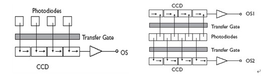 線陣CCD結(jié)構(gòu)(左為單通道、右為雙通道)