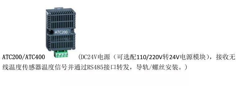 說明:ATC400 無線溫度收發器最多可連接 240 路無源無線溫度傳感器 ATE300(捆綁式安裝),可接收多臺柜內的無線溫度傳感器溫度信號。