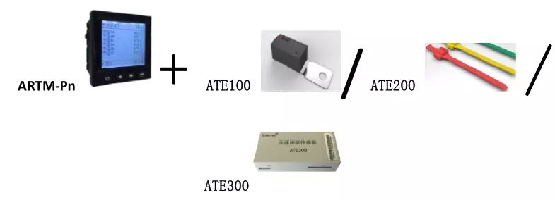 說明:ARTM-Pn 無線測溫裝置最多可連接 18 路無線溫度傳感器,無源(CT 取電)方式為 ATE300(捆綁式安裝),有源(電池供電)方式為 ATE100(螺栓式安裝,主要用于電纜/銅排等螺絲固定的搭接點)和 ATE200(表帶式,主要用于斷路器觸頭等接點捆綁安裝,因安裝較 ATE100 更方便,電纜/銅排等搭接點也常選用)。